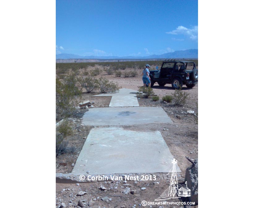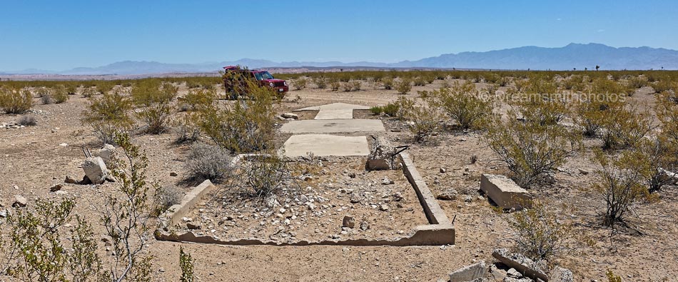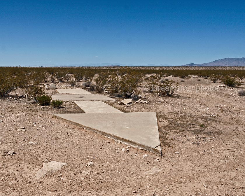 The Mormon Mesa #30 Arrow is fairly close to the southbound lanes of I-15. Upon leaving Las Vegas we drove northbound on I-15 and exited at SR-170. Crossing over the freeway we then drove southbound for 1.5 miles before pulling into a ‘truck pull-out’ alongside the freeway. The dirt road to the arrow begins at the pullout. There was no gate at this location. The drive to the arrow is 2 miles. The dirt road is level but very rocky. Four-wheel drive was not necessary, but our top speed was barely 5 miles mph.
